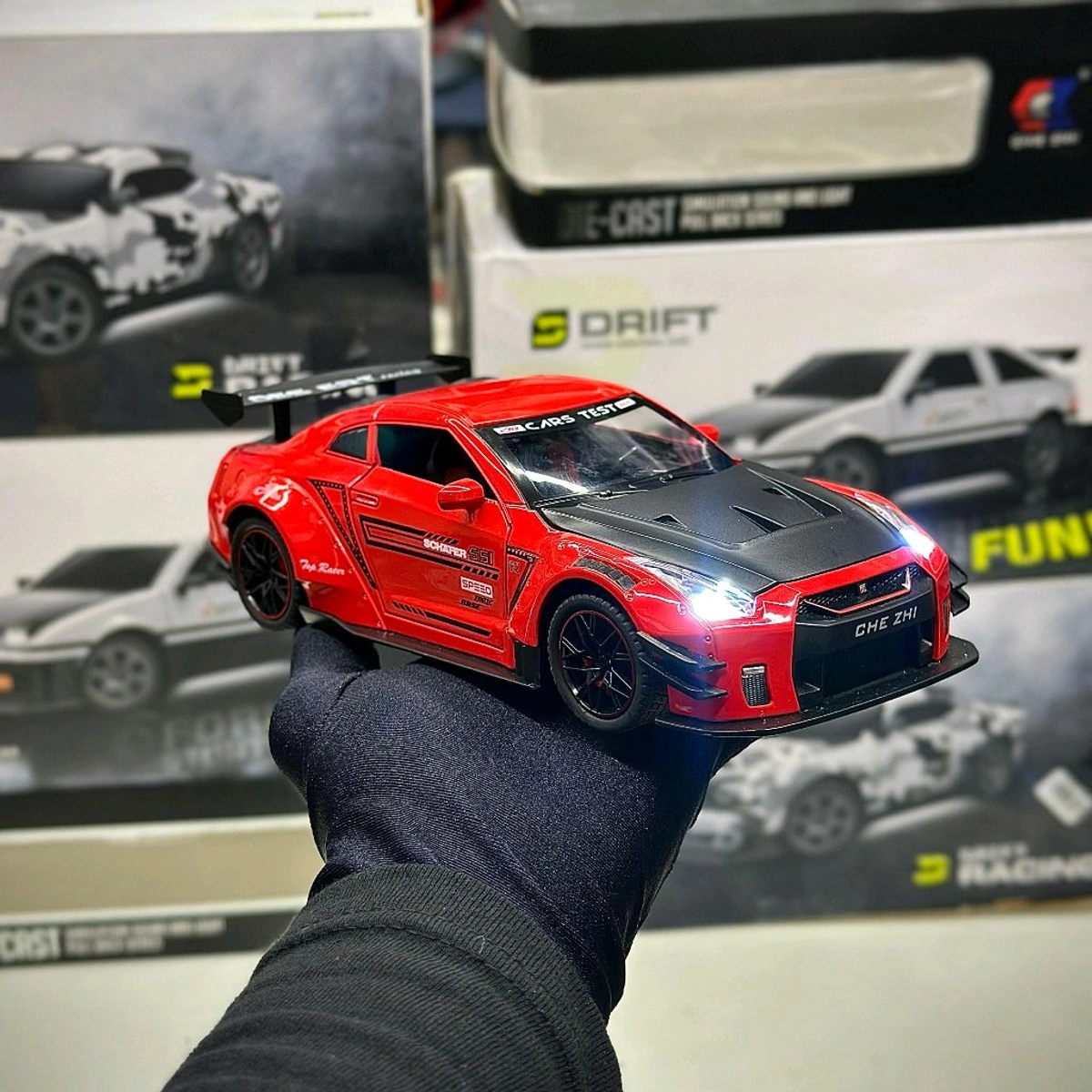 Experience premium detailing with this GT-R diecast car model. Made from high-quality alloy, this pull-back toy features realistic lights, engine sounds, and smooth drift wheels. All four doors, trunk, and hood open just like a real carβperfect for collectors, kids, or as a gift.