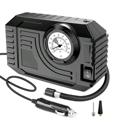 The tire air compressor works with your 12-volt car accessory outlet and features a built-in dial gauge (0-100 psi), air cooled motor, a bright LED light and 10ft power cord.